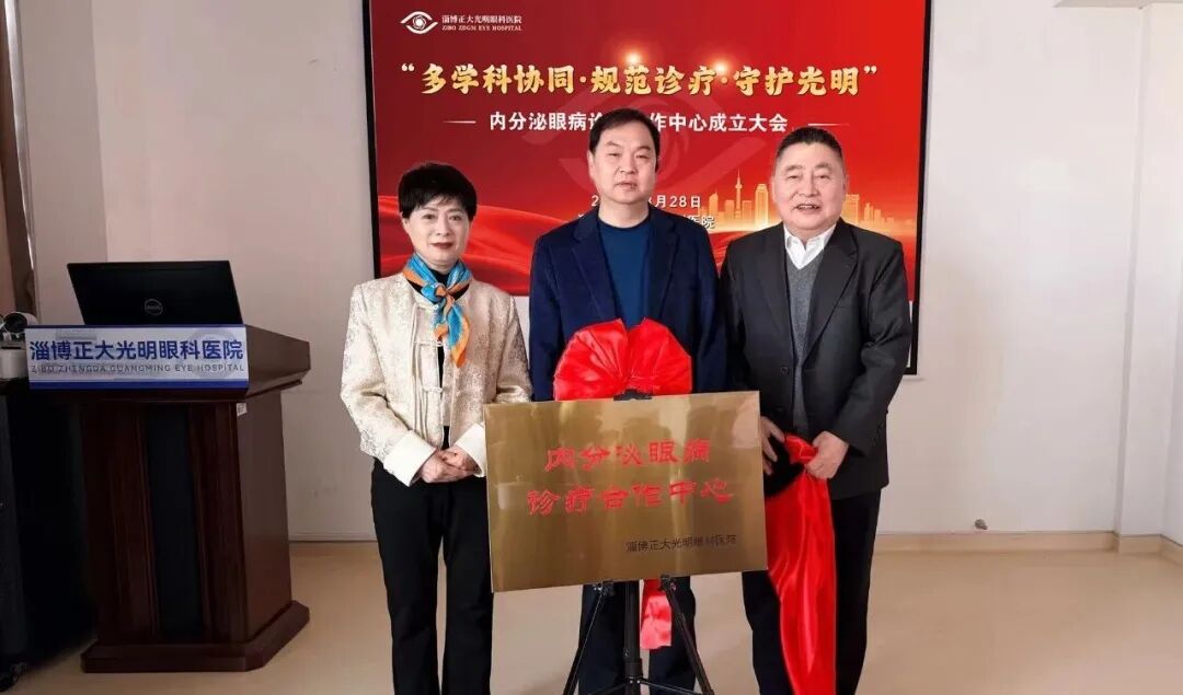 山东省医学会眼科专业委员会副主任委员、淄博市医学会眼科专业委员会主任委员、淄博市眼科质控中心主任王少鹏教授、张店区人民医院内分泌科主任王秀玲教授、正大光明眼科集团鲁中大区院长李凯军教授共同为诊疗合作中心揭牌;